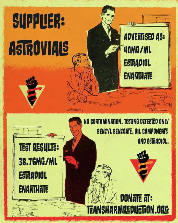 • AstroVials is a single trans woman based in France producing injectable Estradiol vials. They've been operating since early 2023 and have slowly gained a positive reputation within the wider trans community. They claim to have biotech and process engineering qualifications which are exactly the skills required to do this work professionally. The details they have shared of their process check all the boxes required to consider them trustworthy. Several users of this site have reported successful orders receiving vials exactly as described.